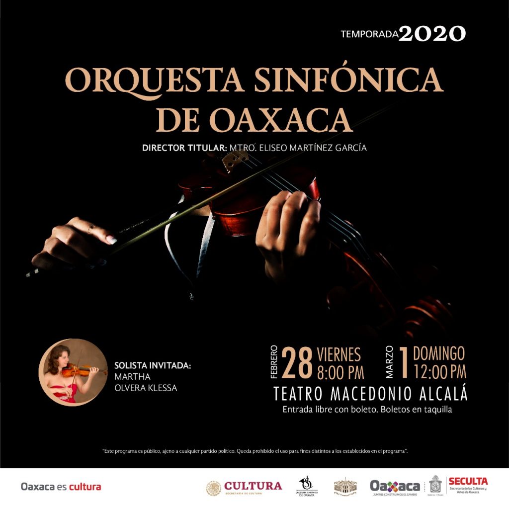 La Secretaría de las Culturas y Artes de Oaxaca (Seculta), invita a la ciudadanía oaxaqueña y visitantes a disfrutar de los conciertos de la Orquesta Sinfónica de Oaxaca (OSO), programados para este fin de semana en el teatro Macedonio Alcalá, eventos de acceso sin costo pero con boleto.