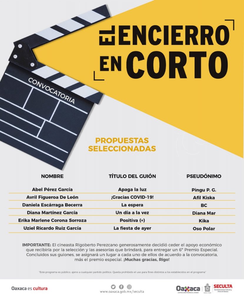 La Secretaría de las Culturas y Artes de Oaxaca (Seculta) anunció los resultados de los seis guiones ganadores de la Convocatoria “El encierro en corto”, mismos que recibirán asesorías de la mano del cineasta oaxaqueño Rigoberto Perezcano.