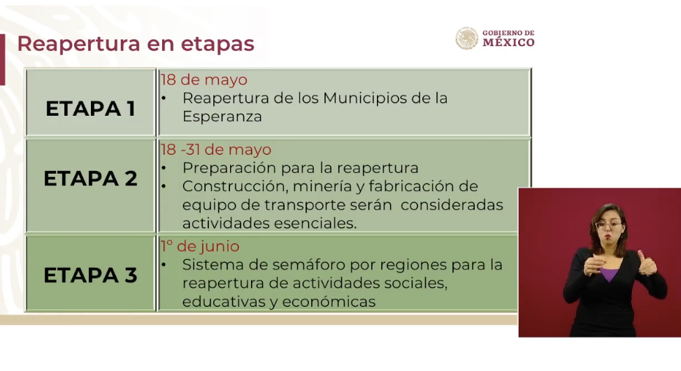 - Primera etapa 18 de mayo: Municipios de la Esperanza, que son 269 en 15 estados, abierta a actividad escolar y laboral, monitoreados con un cerco sanitario.