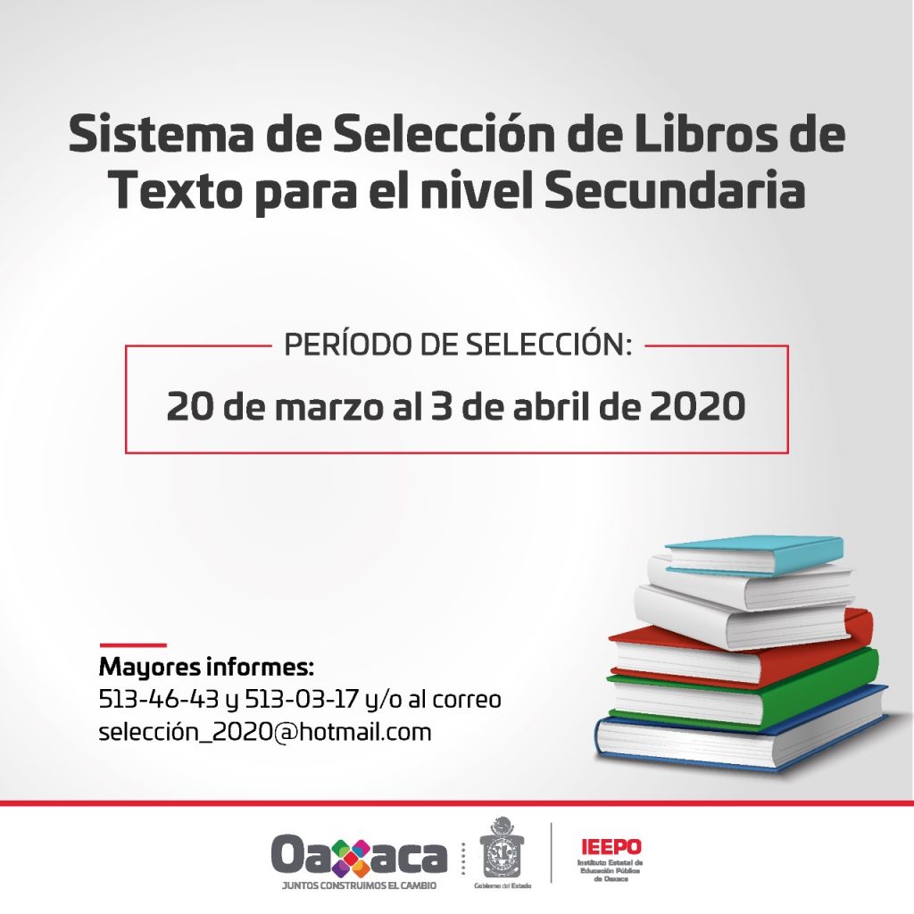 El Instituto Estatal de Educación Pública de Oaxaca (IEEPO) en coordinación con la Comisión Nacional de Libros de Texto Gratuitos (Conaliteg), solicita a las y los directores de las escuelas secundarias, en la modalidad de General, para Trabajadores, Técnicas y Comunitarias, a inscribirse y realizar el proceso de selección de títulos que se emplearán para el próximo ciclo escolar 2020-2021.